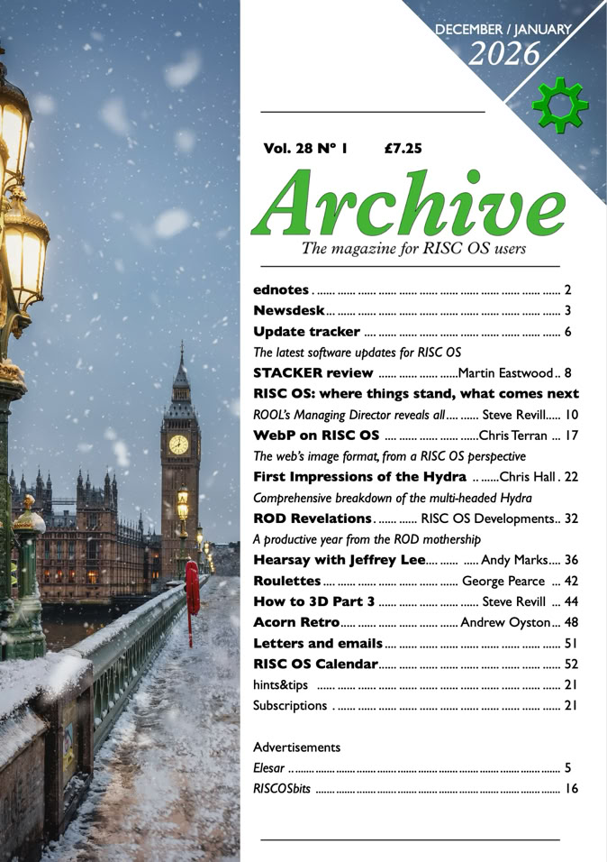 RISC OS is the original operating system for the ARM processor – the Acorn Risc Machine – which Acorn invented in 1986 specifically to power its Archimedes. Today, the ARM is by far the most popular microprocessor on the planet. Archive Magazine has been published ever since 1987 in support of RISC OS. Every issue is packed with the latest RISC OS news, plus articles covering programming, hardware, gaming, tutorials and hints and tips. Archive is available as a print or digital subscription.